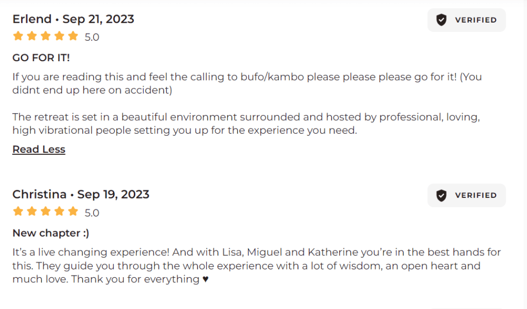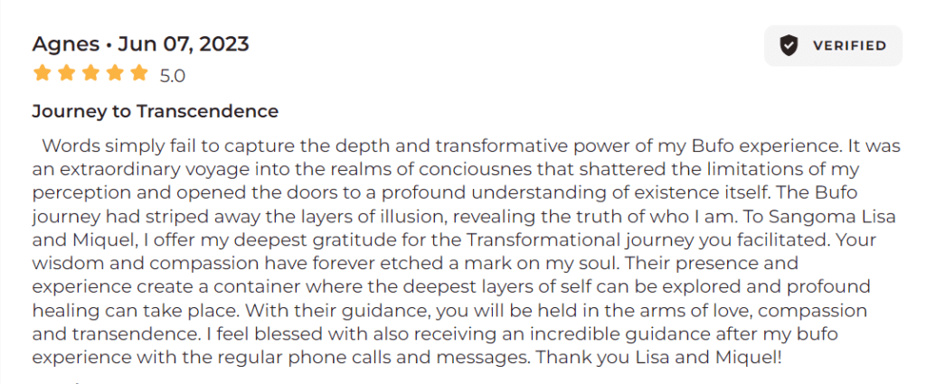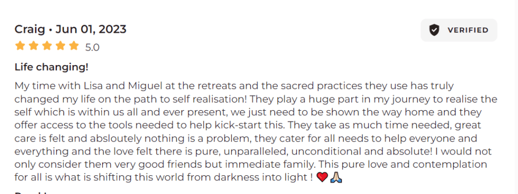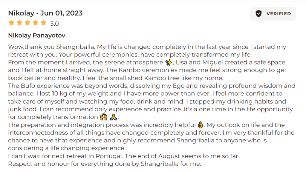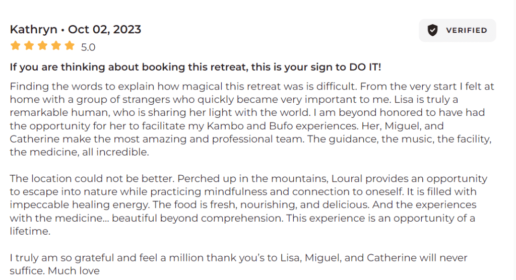 Lisa's warmth and depth of trauma-informed approach in conjunction with the non-dual integration approach are what make... Shangriballa a community and retreat space that stands apart from the rest. Lisa and all the facilitators are devoted to supporting participants in finding their wholeness. Their genuine care shines from their hearts and touches anyone they come into contact with. I wish I had all the words to describe the amount of gratitude I am filled with after attending a retreat. Bufo and Kambo are sacred medicines that are best received when facilitators provide a foundation that supports application. It is evident that Lisa and her team have put a lot of effort into creating a safe, healing container. I will be returning again with total trust in the ethos and vision behind Shangriballa. Healing in community is the future! Thank you from every corner of my being! The retreat was balm for my soul. ✨✨✨✨read more